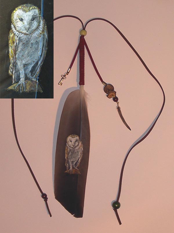 English description: Acrylics on goose feather with suede thongs and several kinds of beads. Finished in 2006.
